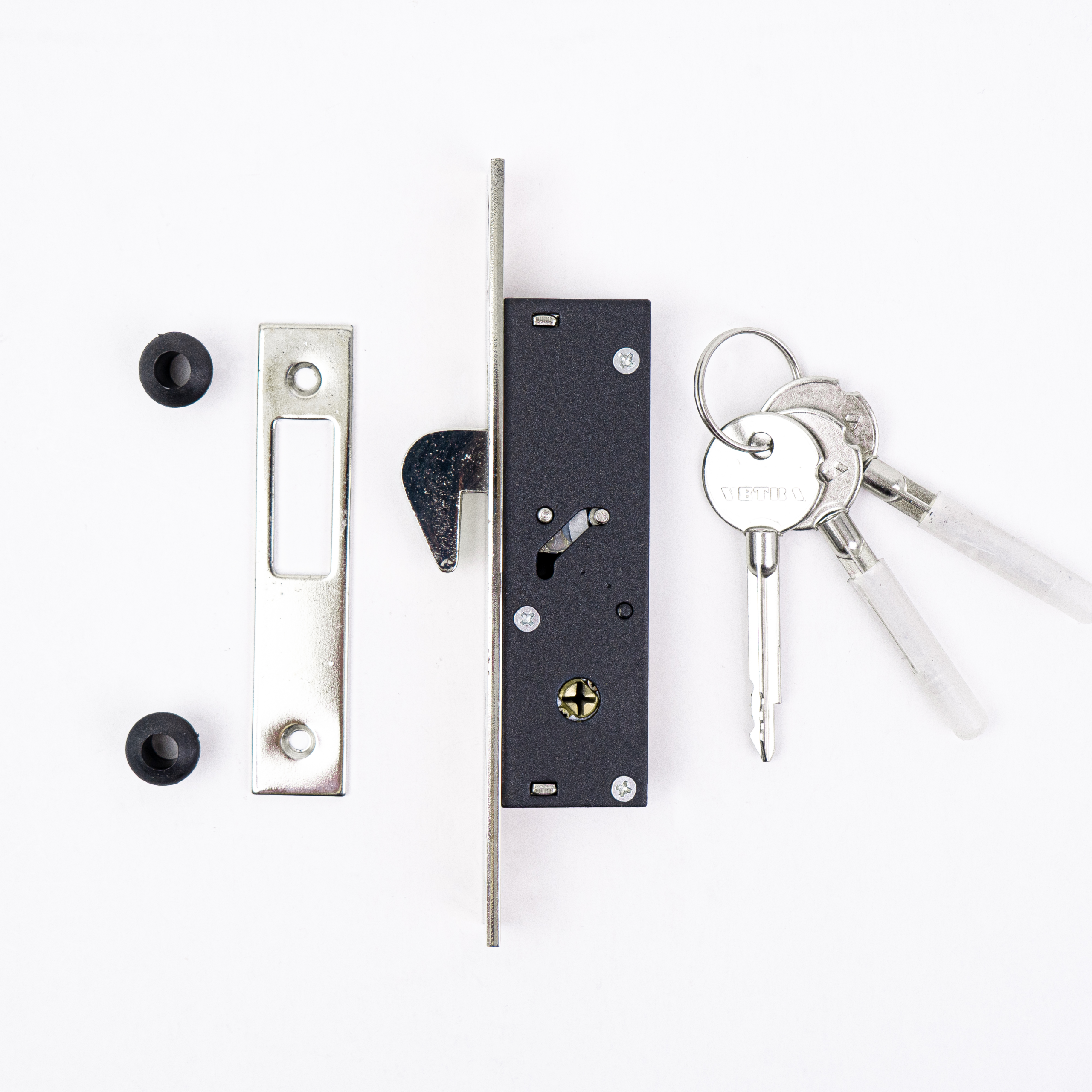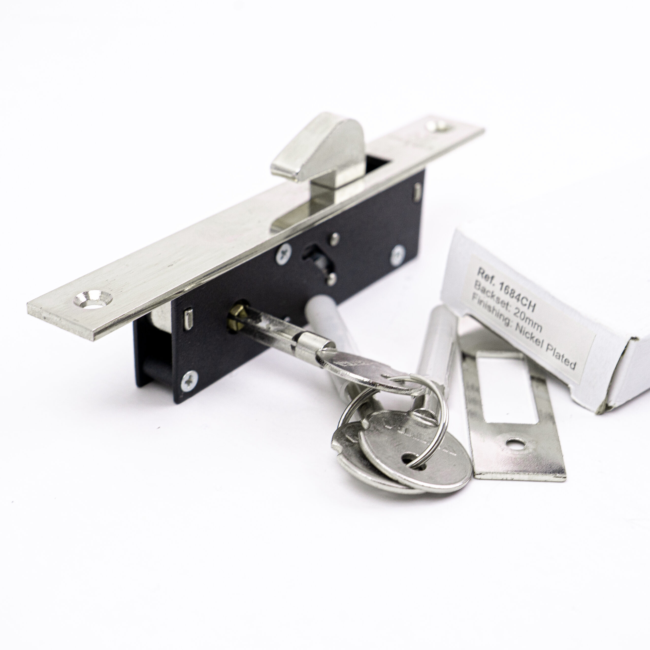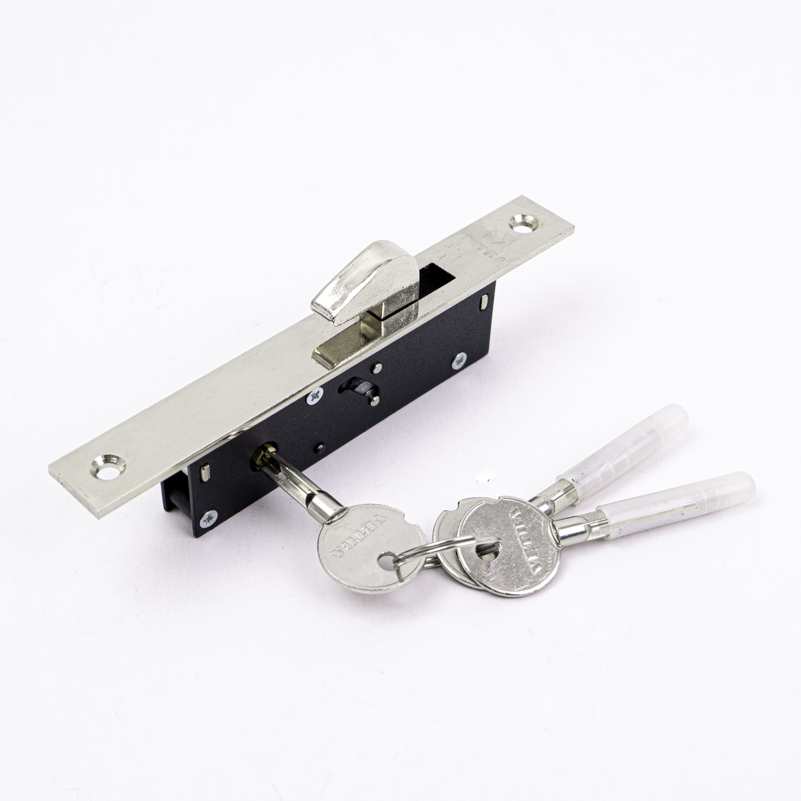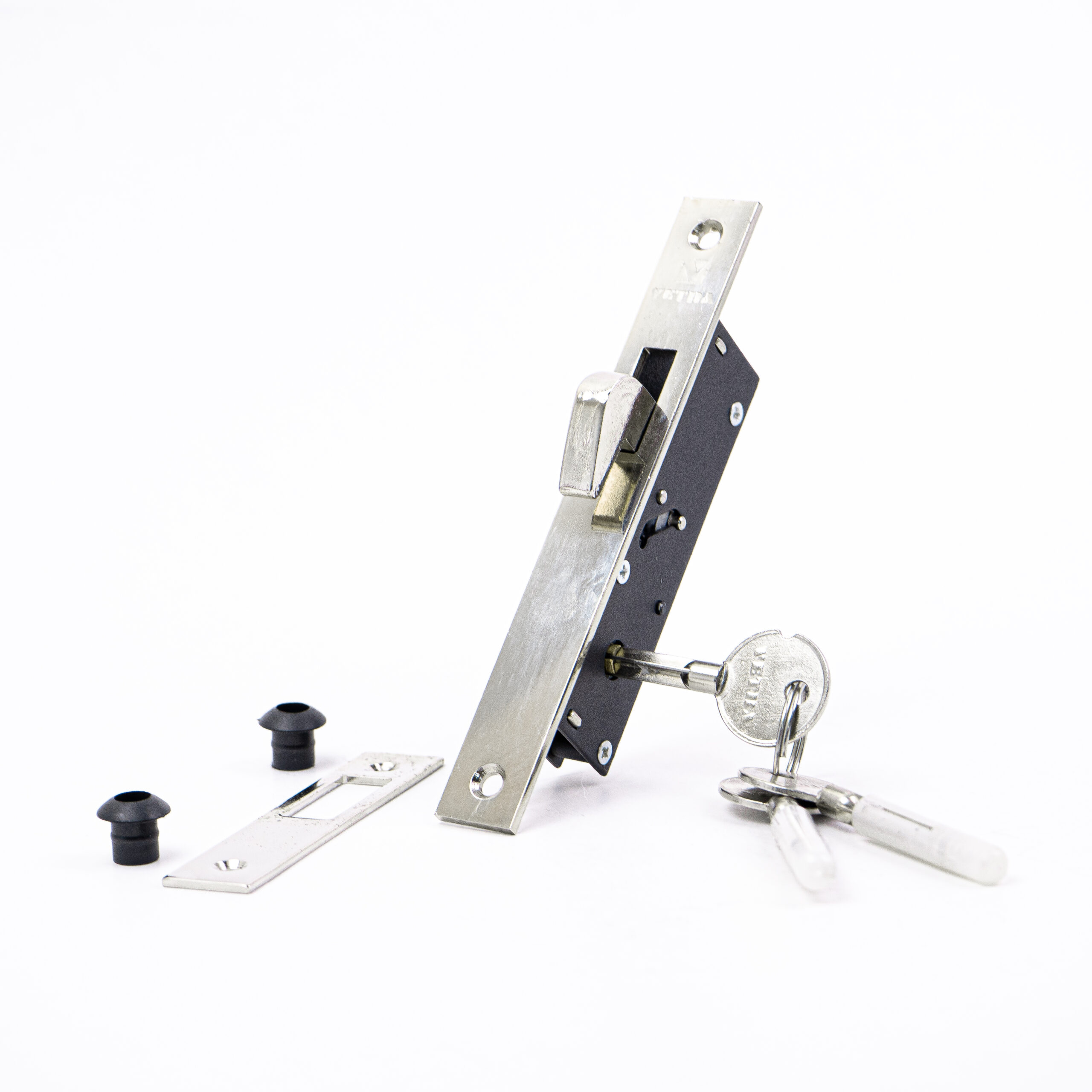 CERRADURA DE INCRUSTAR MARCA VETRA, TIPO PICO LORO CON BACKSET DE 20mm, 3 LLAVES TETRA, ACABADO NIQUELADO. USO PRINCIPAL EN PUERTAS CORREDIZAS
