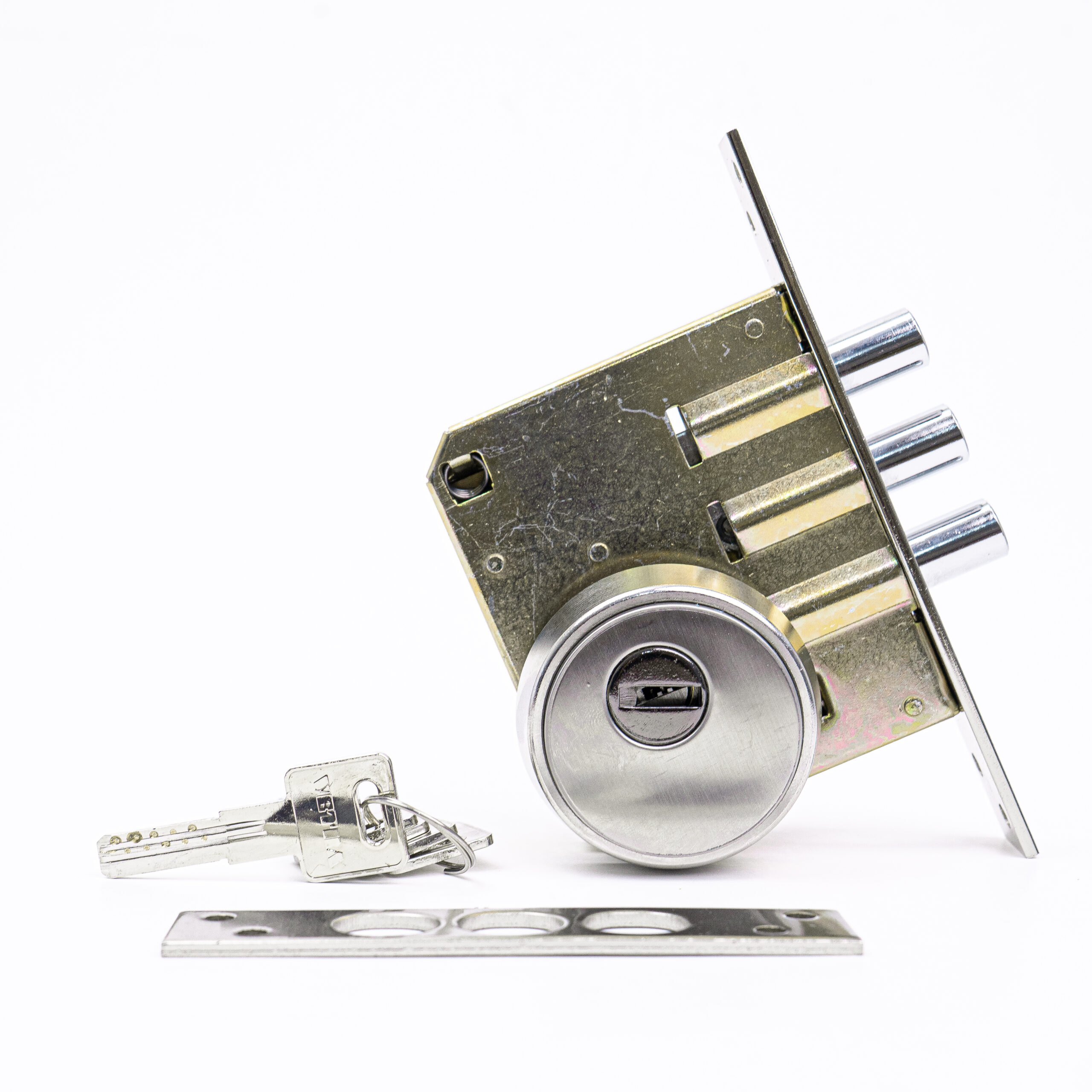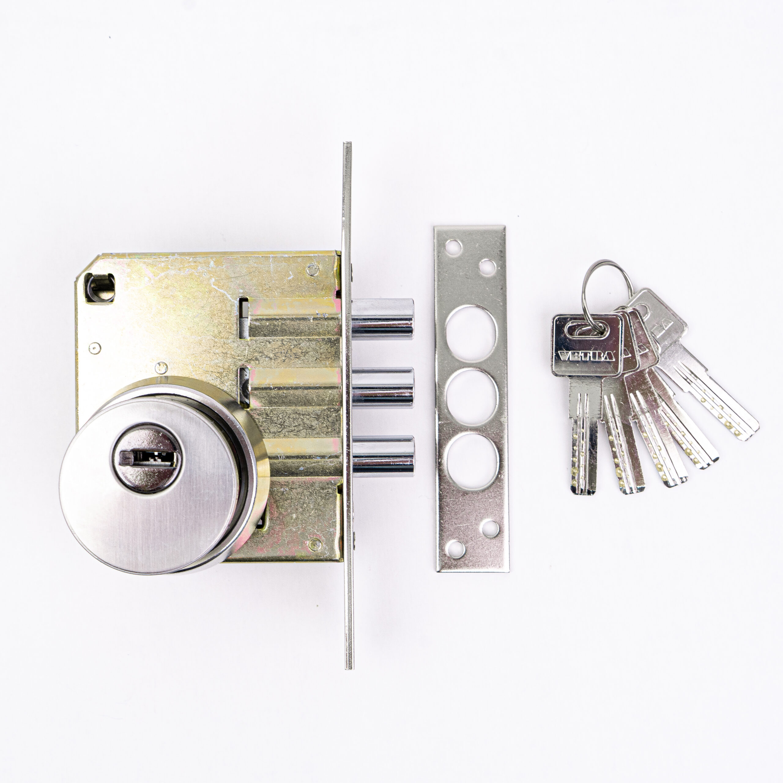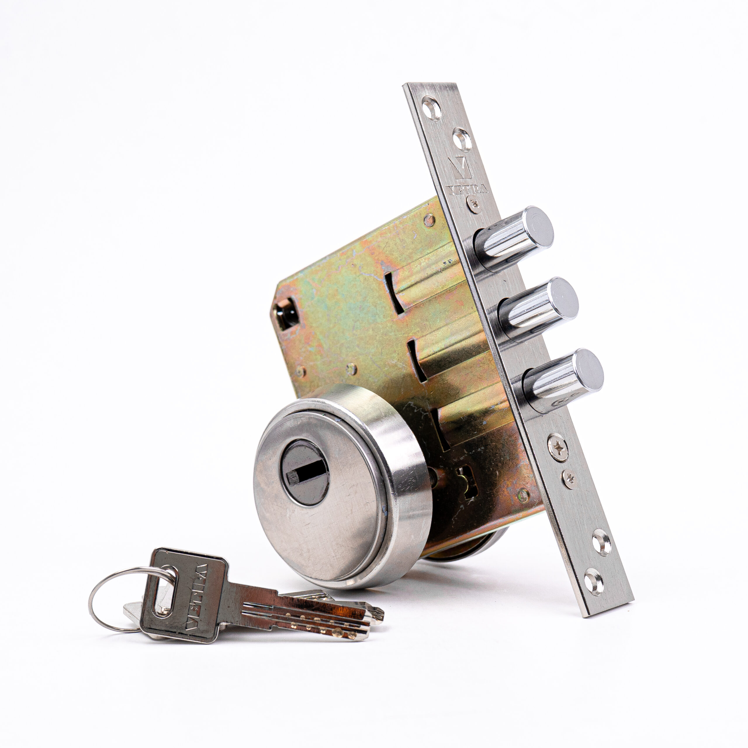 CERRADURA DE INCRUSTAR MARCA VETRA, TIPO AUXILIAR, CAJA CON 3 BULONES, 2 PASOS AL FRENTE, BACKSET DE 50mm, CILINDRO DE 60mm, 5 LLAVES DE SEGURIDAD TIPO PUNTOS, ESCUDO ANTI TALADRO “DEFENDER E200”.