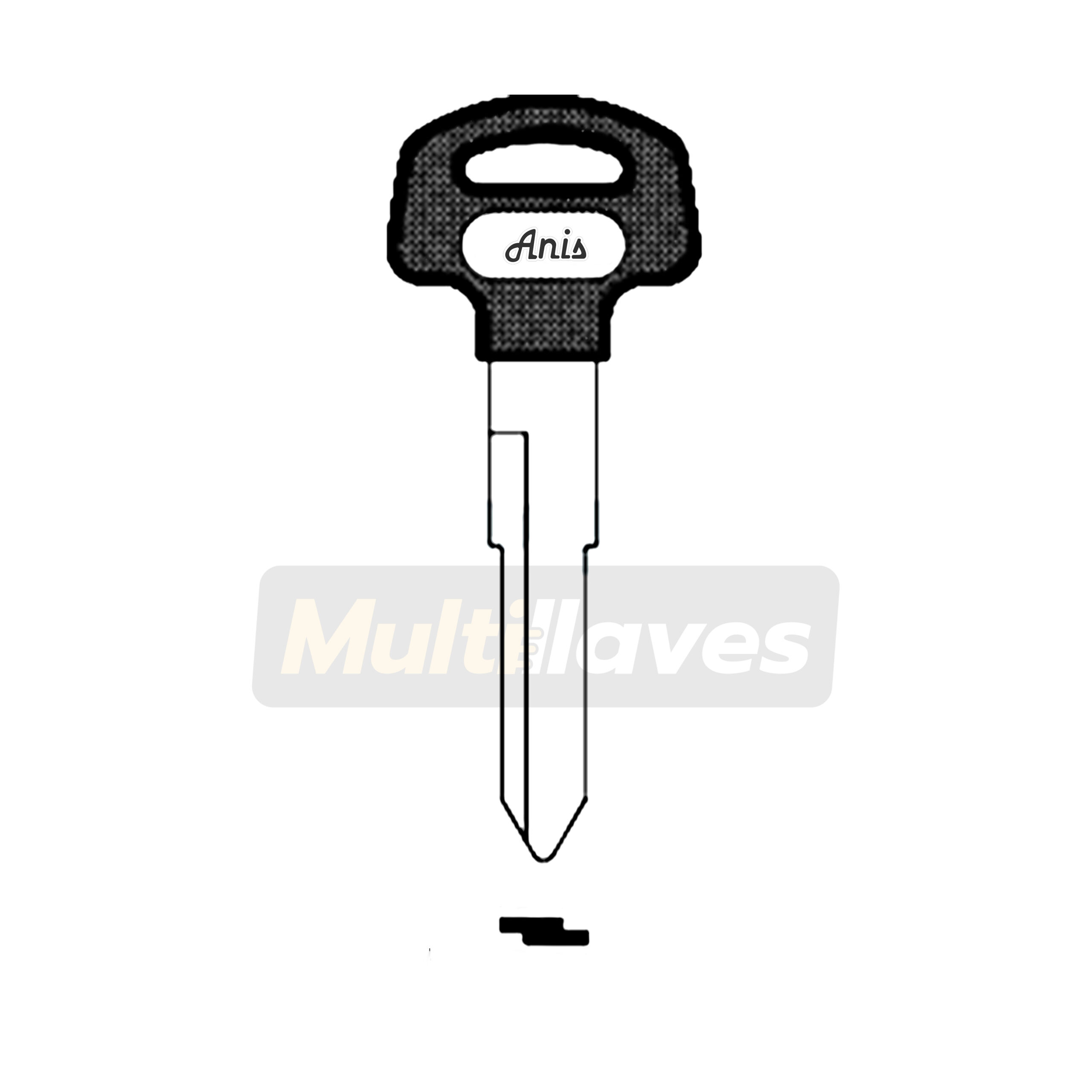 BLANCO DE LLAVE AUTOMOTRIZ MARCA ANIS-RINO PARA MOTOCICLETAS HONDA, HERO. ESPADA DOBLE PALETA IZQUIERDA LARGA, MATERIAL LATÓN, ACABADO NIQUELADO. CABEZA EN PASTA DE LARGA DURACIÓN.