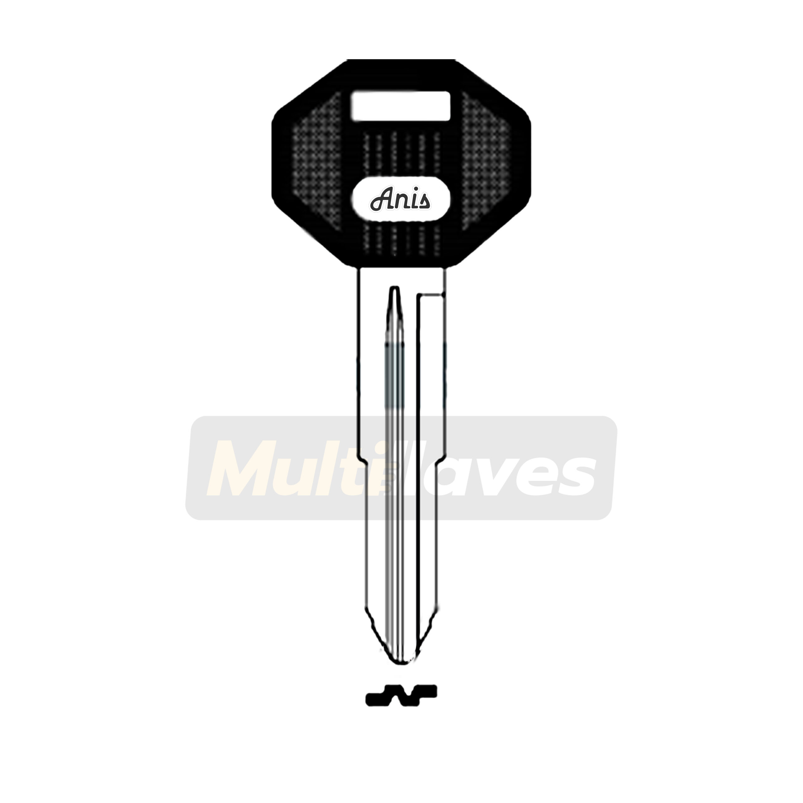 BLANCO DE LLAVE AUTOMOTRIZ MARCA ANIS-RINO, PARA VEHÍCULOS MITSUBISHI, MONTERO PAJERO, NATIVA, SPORTERO, ESPADA PERFIL MIT6RP. MATERIAL LATÓN, ACABADO NIQUELADO, CABEZA EN PASTA DE LARGA DURACIÓN.