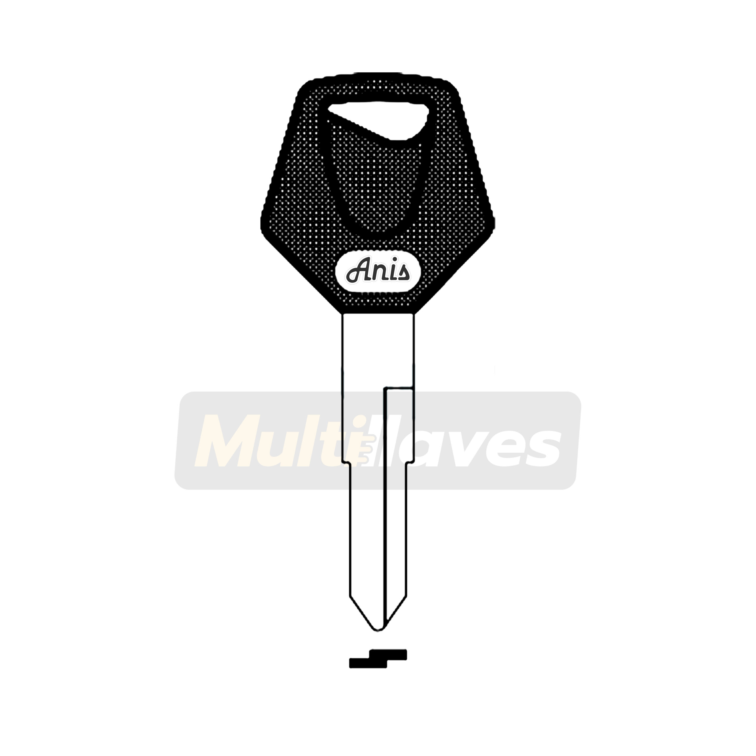 BLANCO DE LLAVE AUTOMOTRIZ MARCA ANIS-RINO PARA MOTOCICLETAS TVS, PERFIL DOBLE PALETA DERECHA, MATERIAL LATÓN, ACABADO NIQUELADO, CABEZA EN PASTA DE ALTA DURACIÓN.